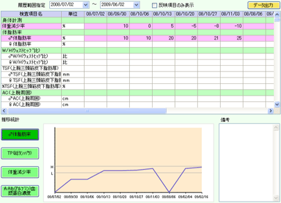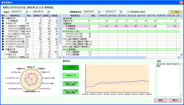 検査日の範囲を指定することで検査項目ごとの推移統計を作成することができます。。
