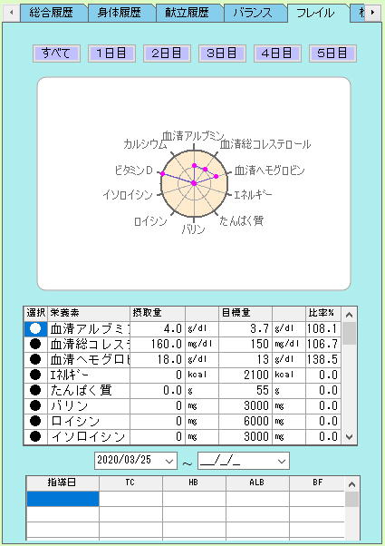 ◆献立履歴 ◆栄養バランス ◆フレイルバランス ◆検査履歴 ◆食事記録
