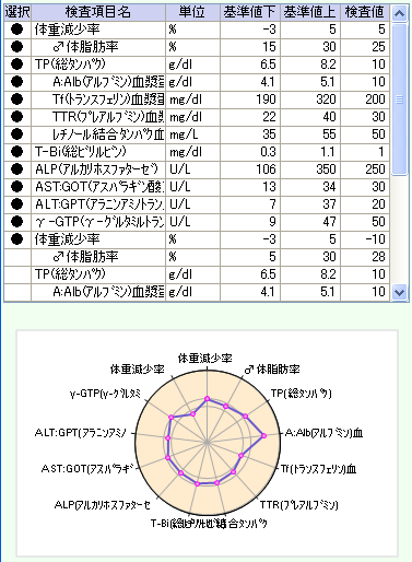 レーダーチャートは、検査項目の選択枠の●をつけたりはずしたりすることでシミュレーションすることができ便利です。