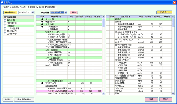 検査項目ごとに基準値の上限下限が設定されており、変更も可能です。