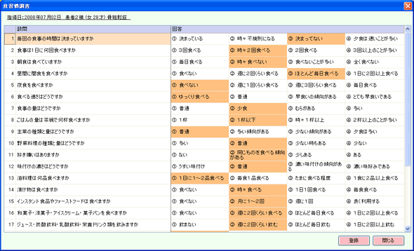 食習慣調査 ◆検査値入力 ◆検査値統計 ◆全体履歴 ◆栄養指導レポート作成